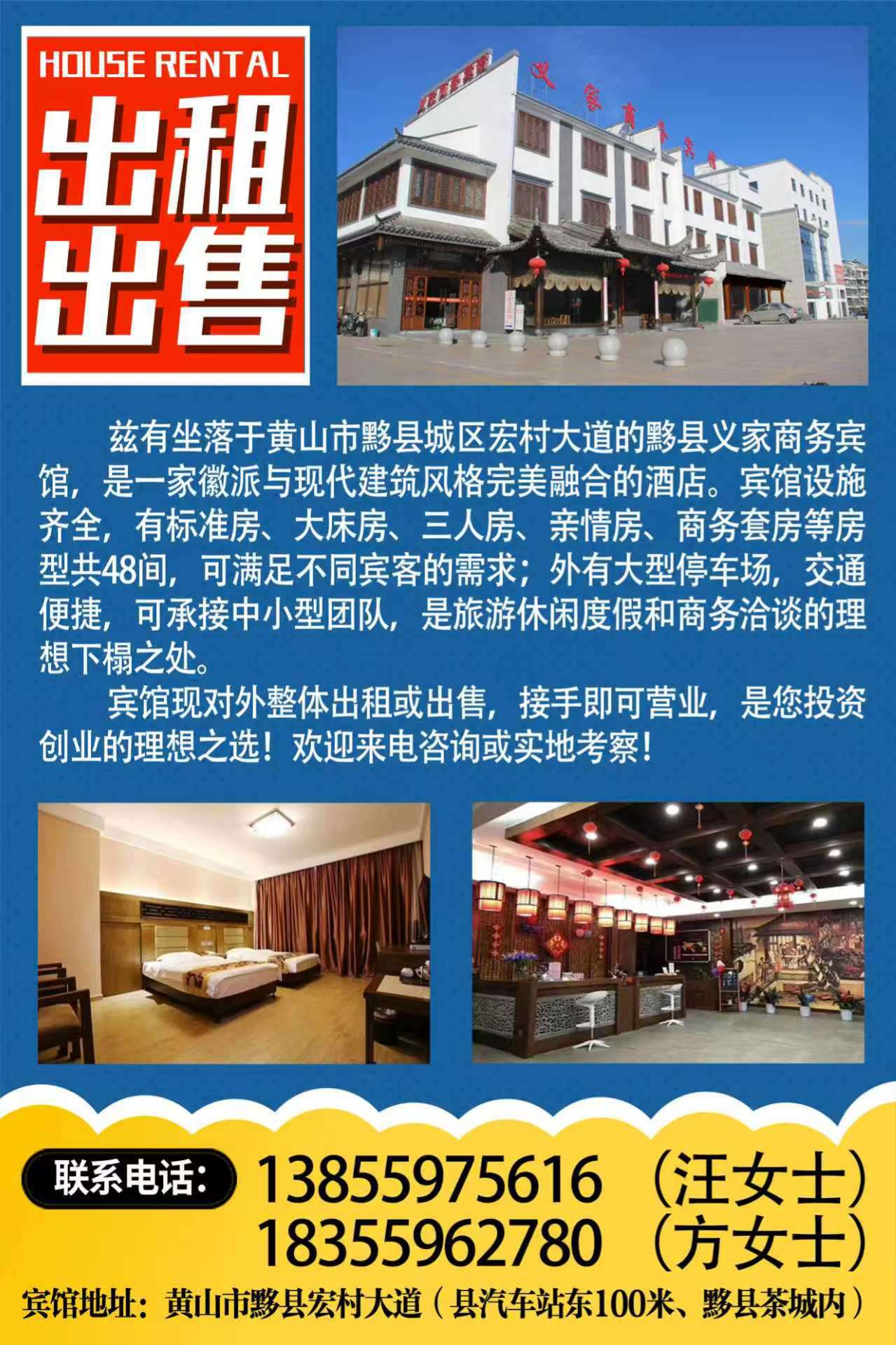 兹有坐落于黄山市黟县城区宏村大道的黟县义家商务宾馆,是一家徽派与现代建筑风格完美融合的酒店。宾馆设施齐全,有标准房、大床房、三人房、亲情房、商务套房等房型共48间,可满足不同宾客的需求,外有大型停车场,交通便捷,可承接中小型团队,是旅游休闲度假和商务洽谈的理想下榻之处。