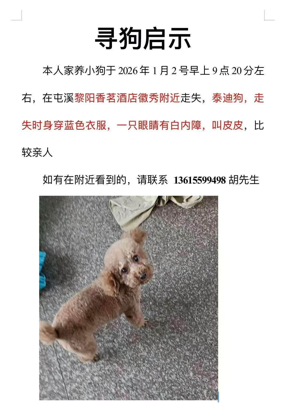 寻狗启示重谢1000元